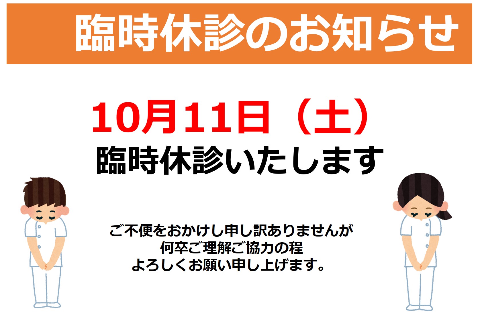 【お休みのお知らせ】 画像説明文 急な告知になり申し訳ございません。 10月11日(土) 午前(保険施術)・午後(特別予約施術) 👉ともにお休みとなります🙇♂️ 皆様にはご不便をおかけし申し訳ありませんが何卒ご理解ご協力の程よろしくお願い申し上げます。 ※急患の方は【お電話】または【公式LINE】にてご連絡ください📞💬